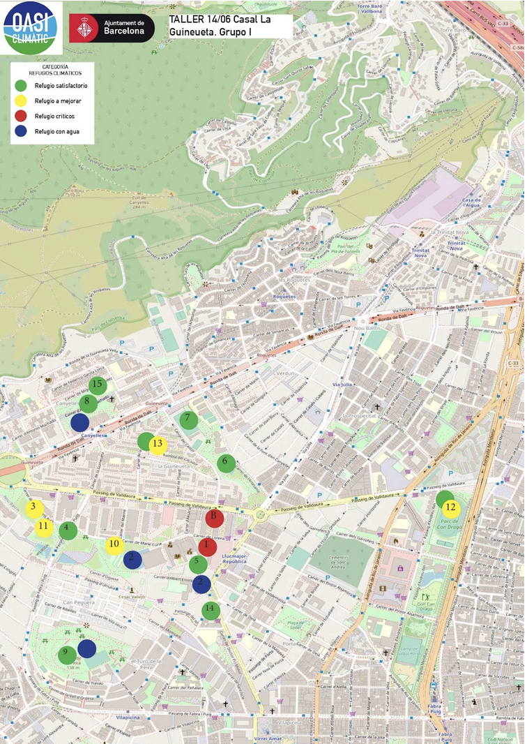 S’ha iniciat amb un diagnòstic participat sobre la base d’un mapa del barri per qualificar els espais verds i públics existents d’acord amb una definició de refugi climàtic, consensuada entre totes, que inclogui no només uns factors físico-ambientals (arbrat, aigua, ombra…) sinó també socials (elements per seure i xerrar, netedat, accessibilitat, …).