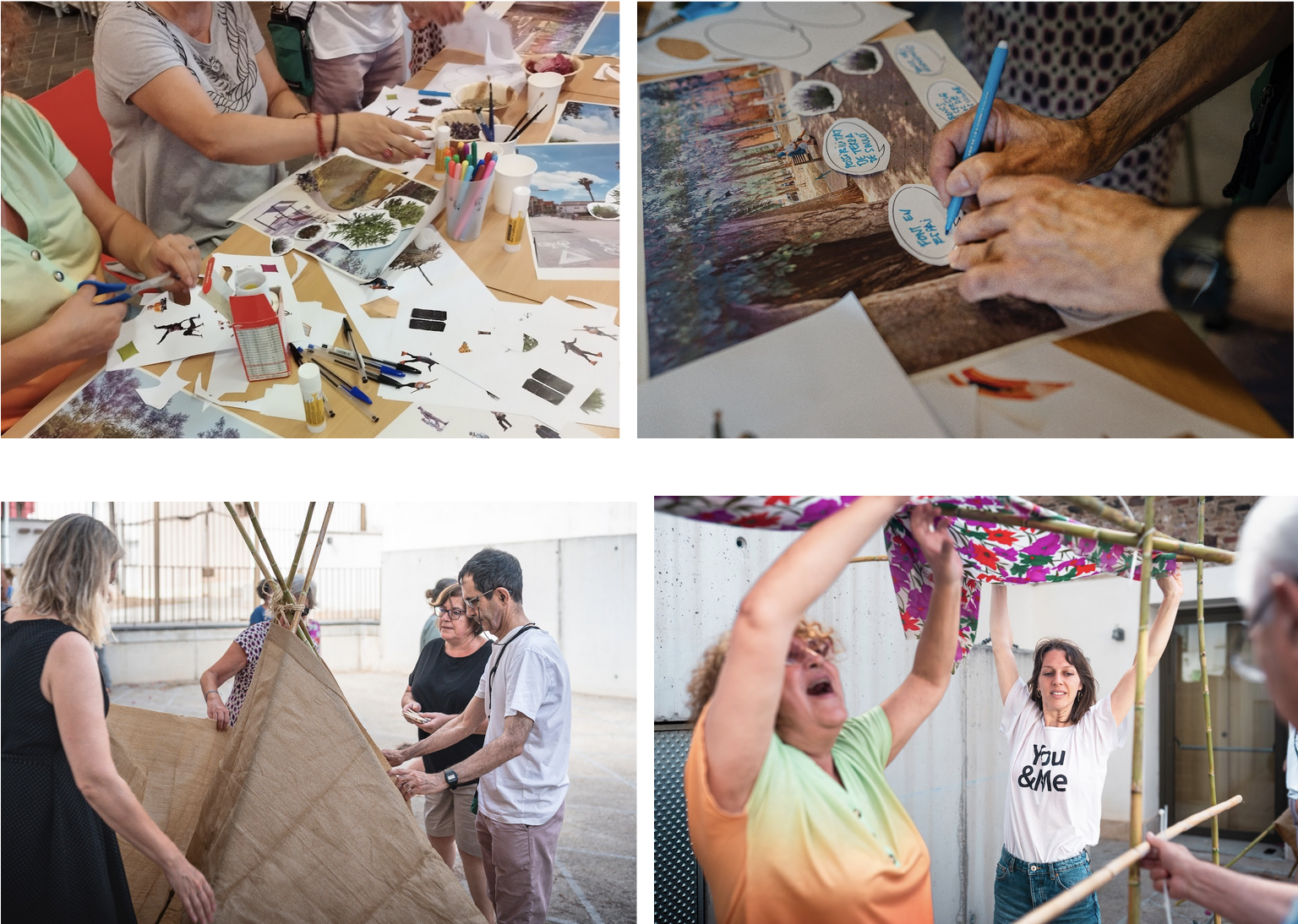 Per activar el moment de la reflexió, el debat i la cerca de solucions, s’han ofert eines de creació artística com el collage i la construcció de prototips efímers a escala real, amb materials senzills (teles, canyes, cordes, …) i de forma col·laborativa. No han faltat propostes d’activitats més lúdiques per facilitar la cohesió del grup i preparar-lo pel treball col·laboratiu.